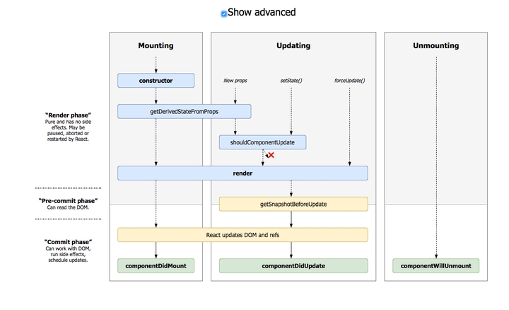 当shouldComponentUpdate()的返回false时,UNSAFE_componentWillUpdate(),render()和componentDidUpdate()都不会被调用。